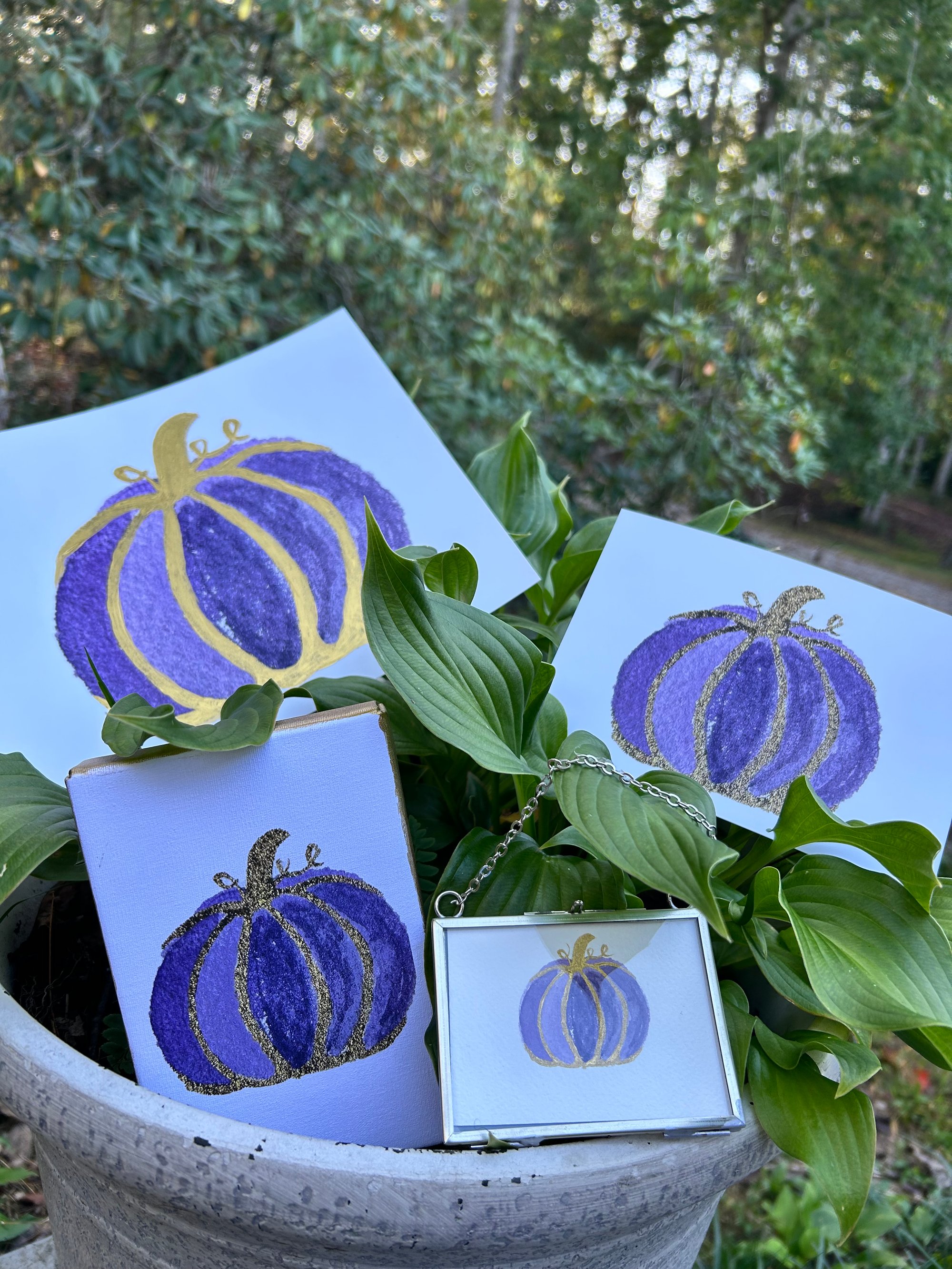 Purple Harvest – A watercolor pumpkin in vibrant purple hues with a warm gold accents. This unique seasonal artwork adds an elegant twist to fall décor and brings cozy charm to any space. Reproduced as a fine art giclée print available in 5x7 and 8x10. Also available as a 4x6 canvas with hand painted gold embellishments along the side, or original hand painted artwork framed in an or original hand painted artwork framed in an ornament frame ornament framed as an ornament. This art is perfect for gifting or displaying year-round.